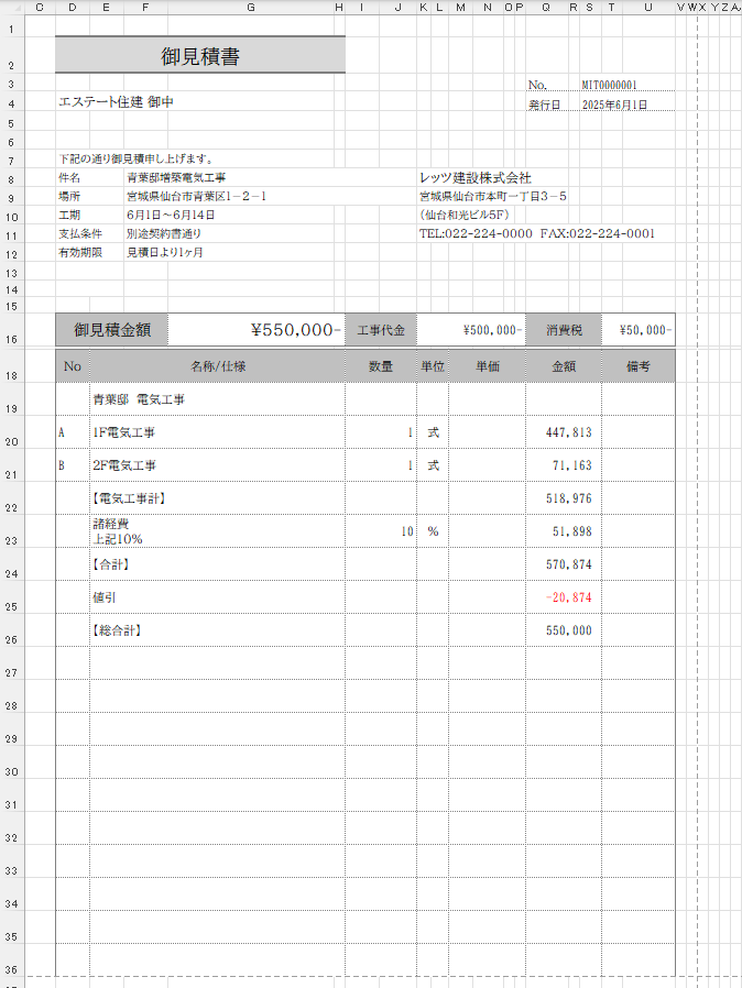 レッツ工事台帳V8の見積書と同じレイアウトで帳票を出力します。
