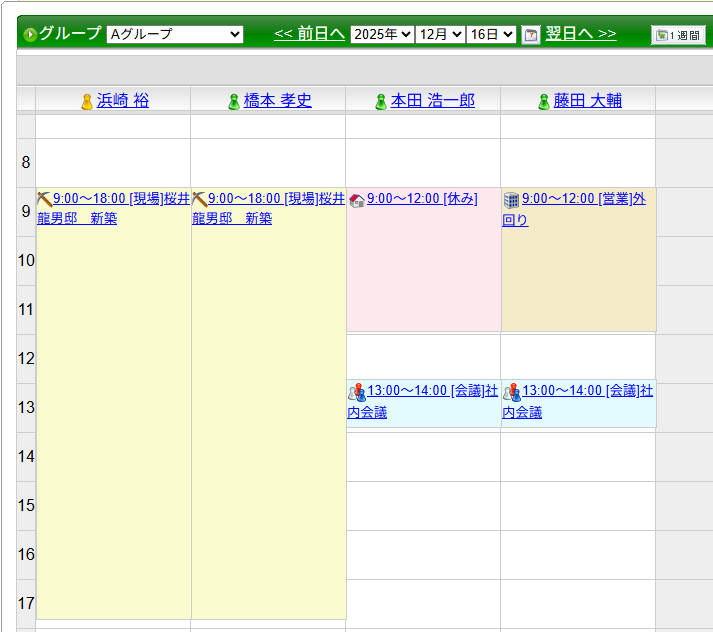 1カ月毎の予定から1週間・1日毎の予定と切替可能です。
