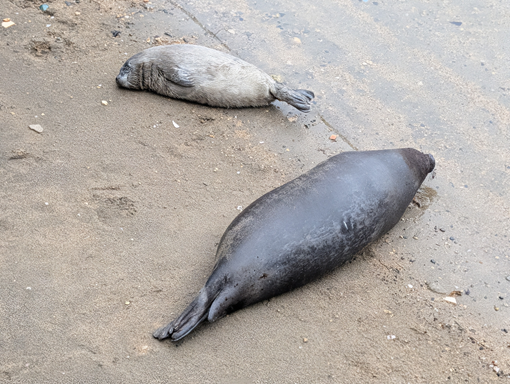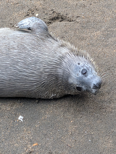 当日はあいにくの雨模様で、赤ちゃんの毛が濡れてしまっていたため「白くてふわふわ」とはいきませんでしたが、お母さん(?)と一緒に波打ち際で横になっている姿は、本当にかわいくて癒やされました。