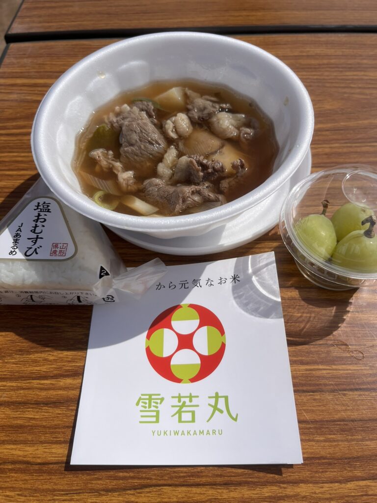 特に、醤油ベースに牛肉がたっぷり入った山形らしい芋煮は、疲れた体に染みわたる最高のエネルギー補給になりました。みずみずしいマスカットも美味しくて、もう大満足です。