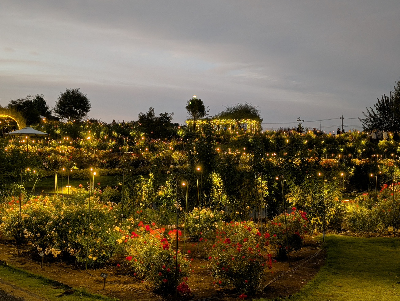 17時からはライトアップもあり、夕暮れ時にライトアップされるバラ園はとってもきれいでした。
