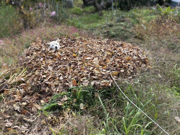 外で飼っている愛犬のハチは、落ち葉の山ができると、自分の居場所ができたとでも言うように、機嫌良さそうに近づいていきました。